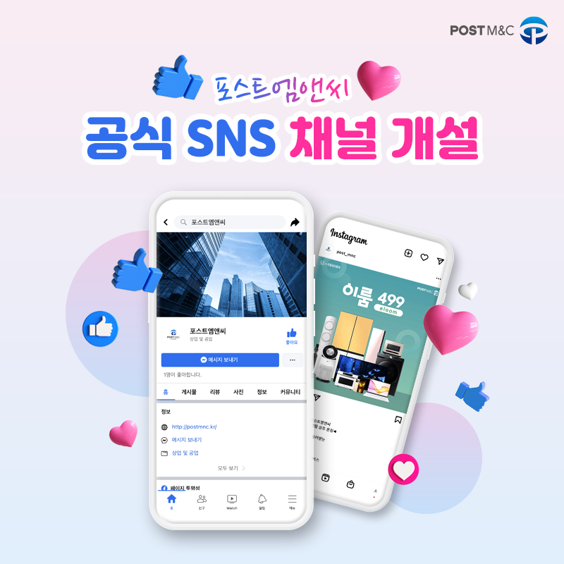 포스트엠앤씨를 사랑해주시는 분들과 더 가까이 소통하기 위해포스트엠앤씨 공식 SNS를 오픈했습니다.앞으로 포스트의 SNS에서 더욱 유익하고많은 소식을 만나보세요!포스트엠앤씨 페이스북포스트엠앤씨 인스타그램감사합니다.